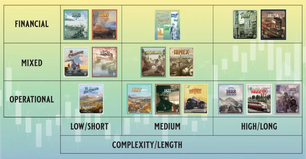 The more introductory games like 1889, 18Chesapeake, and 18MS, which are based on financial strategies from 1830. These games focus on timing investments and manipulating stock prices. The most significant game in this financial category is 1817, which can last over 12 hours due to its complex stock market dynamics.